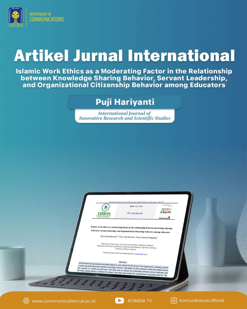 Penelitian berjudul “Islamic Work Ethics as a Moderating Factor in the Relationship Between Knowledge Sharing Behavior, Servant Leadership, and Organizational Citizenship Behavior Among Educators” yang digarap oleh dosen Prodi Ilmu Komunikasi UII, Puji Hariyanti, S.Sos., M.I.Kom dan beberapa dosen lainnya telah terbit di International Journal of Innovative Research & Scientific Studies (IJIRSS), Scopus Q3.